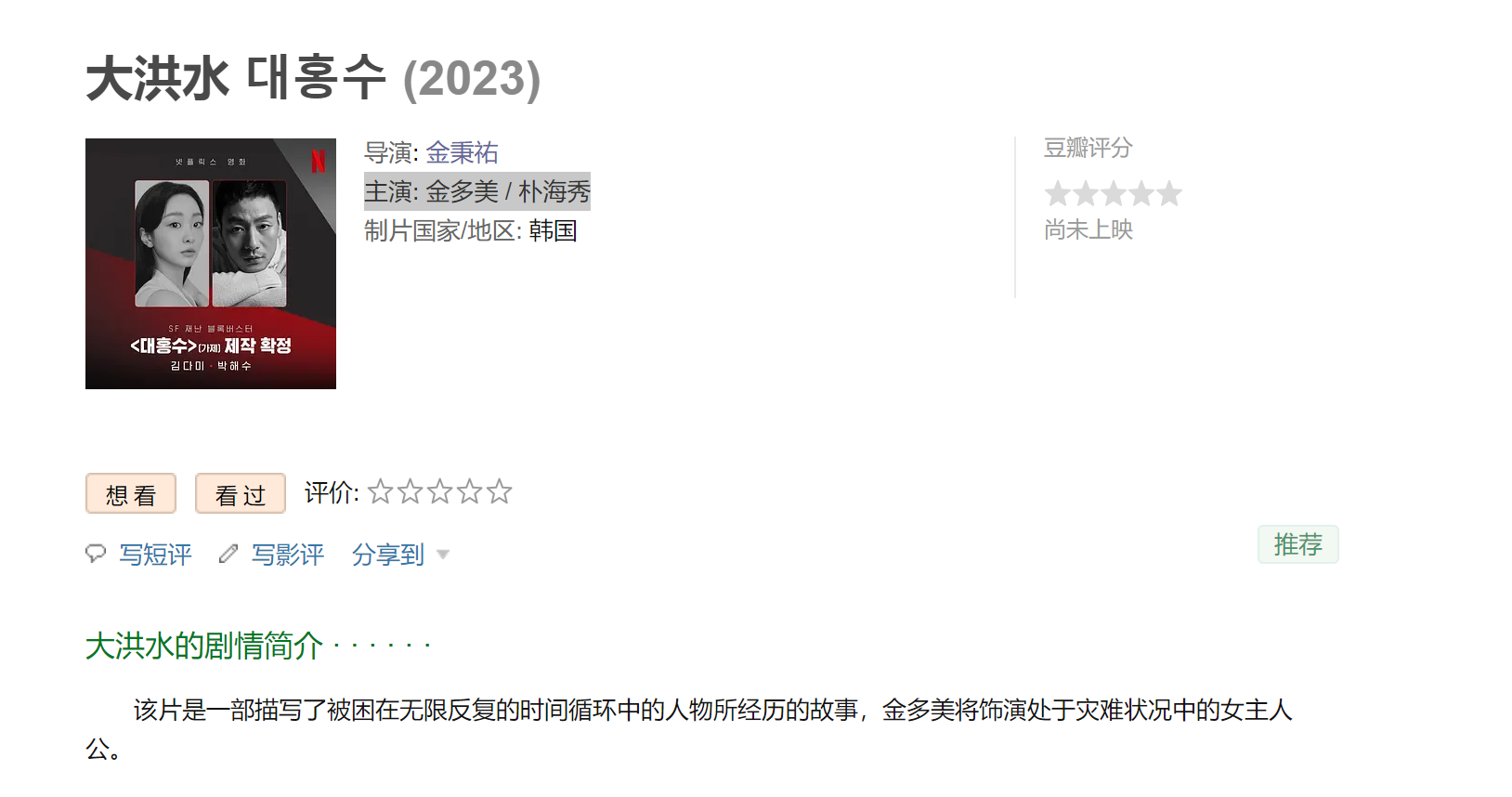 据悉《恐怖直播》导演金秉宇又有新作《大洪水》在筹备,主演是金多美和朴海秀,电影暂定为2023年播出,不管是演员阵容还是导演功力,都值得影迷期待!