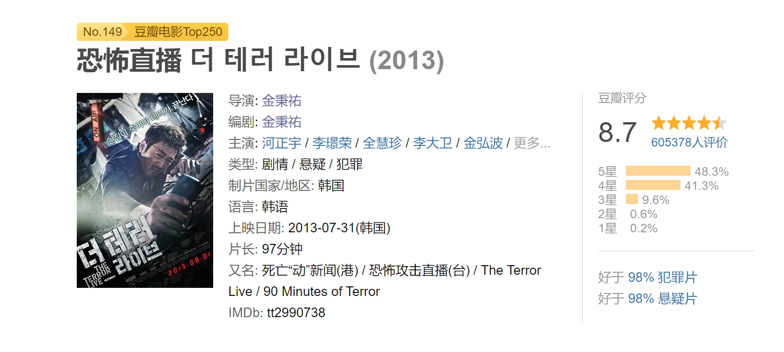 但在它们之前的2013年,韩国有一部低成本、小众导演制作的悬疑犯罪电影《恐怖直播》,在豆瓣Top榜中跟在《釜山行》后面,成为韩国第一密闭空间电影。